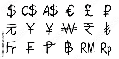 Hand drawn currency symbol set Dollar euro pound ruble yuan yen won rupee lira franc peseta baht ringgit rupiah