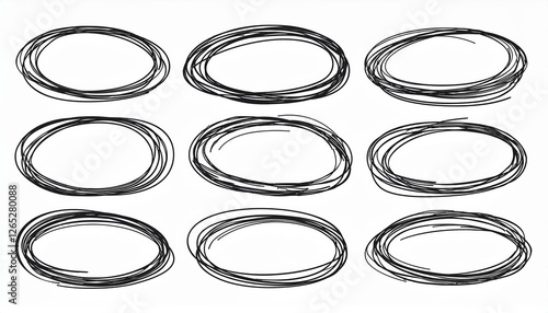 Hand drawn doodle oval set. Hand drawn marker, pen stroke line oval frame. Scribble round frame for text highlight. Grunge scratch style set. perfect any project