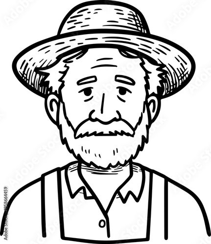 Hand Drawn Elderly Farmer Man Black and White Illustration in Minimal Solid Art Style Design
