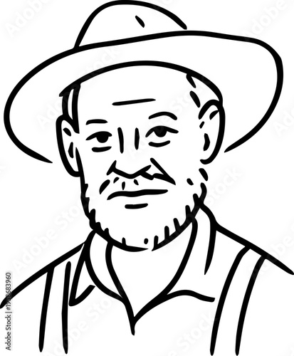 Hand Drawn Elderly Farmer Man Black and White Illustration in Minimal Solid Art Style Design