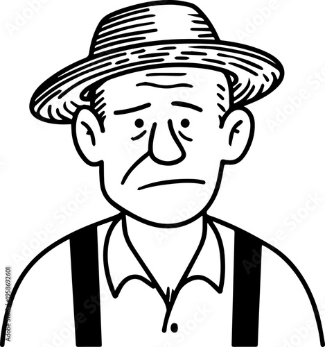 Hand Drawn Elderly Farmer Man Black and White Illustration in Minimal Solid Art Style Design