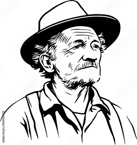 farmer, agriculture, farming, rural, countryside, field, harvest, crop, plantation, dirtied, nature, organic, men at work, labourer, occupation, job, profession, old, elderly, senior, man, male, avatar, portrait, character, illustration, hand-drawn, silhouette, shape, bold, monochrome, black, white, minimal, minimalism, simple, clean, modern, flat, vector, graphic, icon, isolated, background, digital, editable, clip art, design