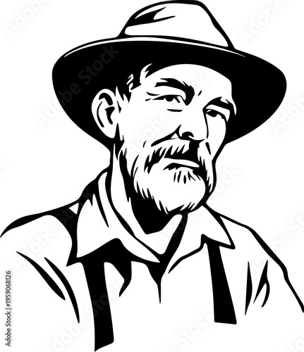 farmer, agriculture, farming, rural, countryside, field, harvest, crop, plantation, dirtied, nature, organic, men at work, labourer, occupation, job, profession, old, elderly, senior, man, male, avatar, portrait, character, illustration, hand-drawn, silhouette, shape, bold, monochrome, black, white, minimal, minimalism, simple, clean, modern, flat, vector, graphic, icon, isolated, background, digital, editable, clip art, design