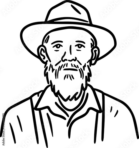 Hand Drawn Elderly Farmer Man Black and White Illustration in Minimal Solid Art Style Design