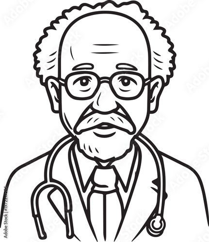 doctor, physician, medic, medicals, health care, hospital, clinic, treatment, patient, medicine, stethoscope, uniform, professional, occupation, job, elderly, senior, old, man, male, avatar, portrait, head shot, character, illustration, hand-drawn, outline, vignetting, contour, monochrome, black, white, minimal, minimalism, simple, clean, modern, flat, vector, graphic, icon, profile, isolated, background, digital, editable, clip art