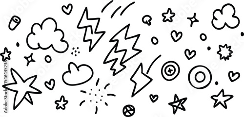 doodle, hand-drawn, vignetting, vector, black-and-white, illustration, design, art, element, cloud, lightning, star, nubes, cute, cartoon, graphic, symbol, simple, set, shape, pattern, drawing, background, decoration, abstract, scribble, line art, icon, outline, isolated, funny, playful, childish, decorative, trendy, modern, minimalist, creative, digital, wallpaper, graphic design, artistic, clip art, whimsical