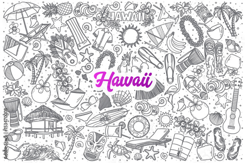 Hand drawn Hawaii doodle set background with purple lettering in vector