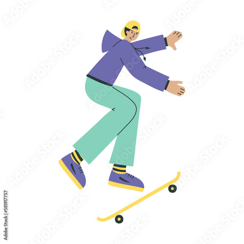 man, skateboard, sport, character, male, fun, casual attire, vector, trendy, active, illustration, person, flat, riding, board, hand-drawn, lifestyle, transportation, young, adult, cartoon, skateboarder, health, purple, motion, extreme, jump, skater, people, sk8, graphic, teenage, positive, hat, drawing, activity, yellow, ride, move
