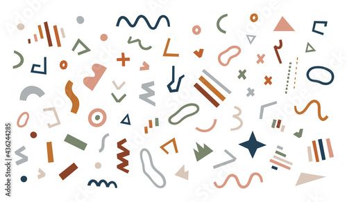Hand drawn modern geometric shapes and figures isolated on white. Colorful simple vector elements, flat illustration. Circles, triangles, dots, zigzags, rectangles and squares. Earthy colors
