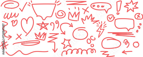 Hand drawn speech bubbles arrows hearts crowns stars checkmarks and emphasis marks for children's art projects