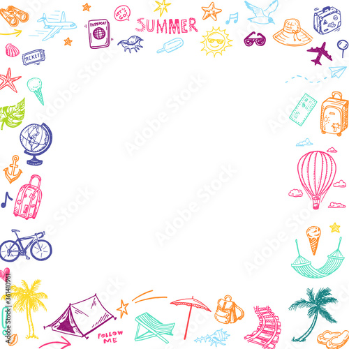 Hand drawn summer holiday, vacation elements square frame. Doodle Travel collection.