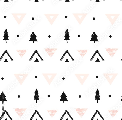 Hand drawn vector abstract modern geometric composition seamless pattern in black, white,and pastel pink colors with freehand rough texture and xmas trees isolated on white background