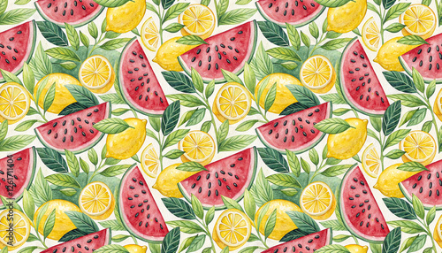 fruit, watermelon, seamless, pattern, lemon, fabric, icon, wallpaper, summer, background, vibrant, design, illustration, graphic, texture, colourful, food, tropical, fresh, sweet, nature, delicious, organic, line, art, vignetting, watercolor, hand-drawn, drawing, horizontal, textile, seamless pattern, collection, healthy, icon, repeat, wrapping, print, citrous, slice, citrus fruit, textured, drink, season, poster, postcard, ornate, leaf, vintage