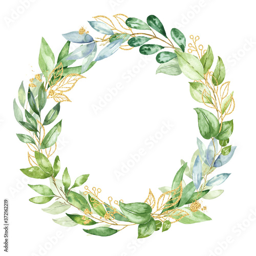 Hand drawn watercolor fresh green floral wreath, laurel frame, foliage design isolated on white background. Watercolour illustration.