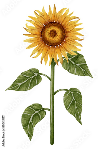 Hand drawn watercolor sunflower with green leaves on white background. Perfect for botanical design, print, posters, decor, packaging.