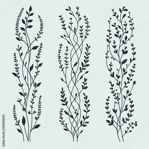 Hand drawn wild flowers Botanical drawing. line art grasses, stems illustration. Black and White Meadow herbs. Herbaceous blooming plants. Set of outline doodle floral sketch Leaves