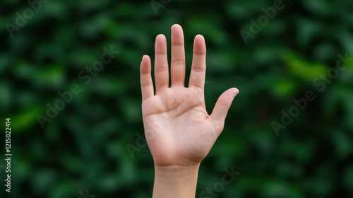 Hand Gesture with Open Palm Against Green Natural Background for Communication and Sign Language Concepts
