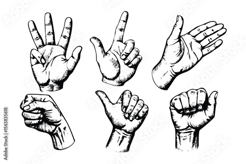 Hand Gestures Vector Engraving Set. Detailed Monochrome Comic Style Illustrations. Vintage Stipple & Hatching Icons & Symbols