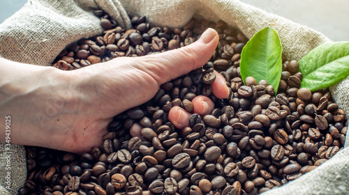 Hand hold a handful of roasted coffee beans over a full burlap of coffee.