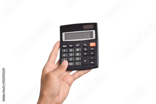 Hand hold calculator isolated on white background