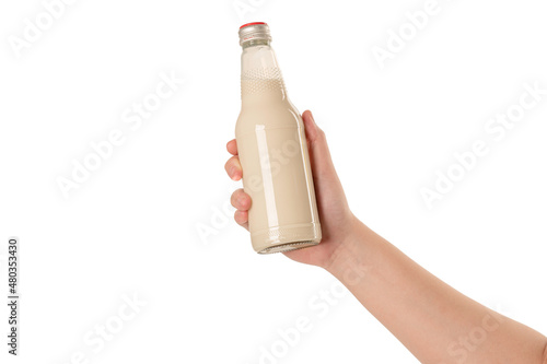 Hand holding a bottle of soy milk on white background.