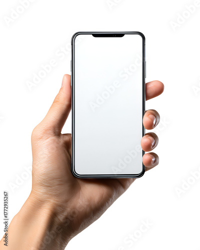 Hand holding a modern smartphone with a blank white screen against a dark background
