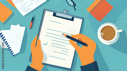 hand holding a pen, writing on a clipboard, with a coffee cup, notebook, and other office items nearby