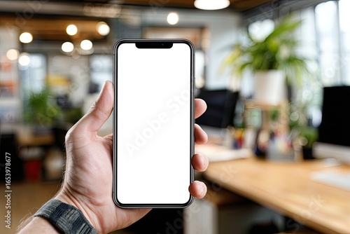 hand, smartphone, blank, screen, office, modern, interior, blurred, background, workspace, business, technology, device, digital, light, warm, contemporary, room, light bulb, plant, desk, wood, computer, accessory, sharpened, display, empty, vertical, image, person, holding, grey, urban, creative, design, detail, closeup, shot, hand, portable, communication, connection, information, bright