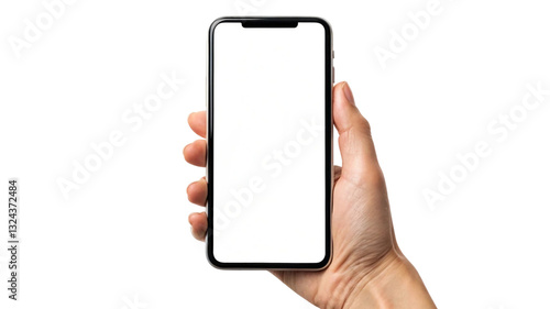 Hand holding a smartphone isolated on white background. Mockup concept. Suitable for marketing or business purposes. PNG file