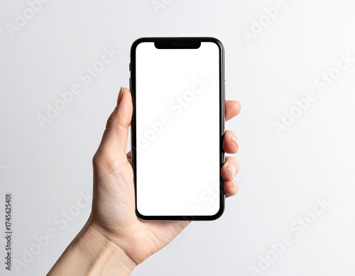 Hand holding a smartphone with a blank white screen, against a white backdrop