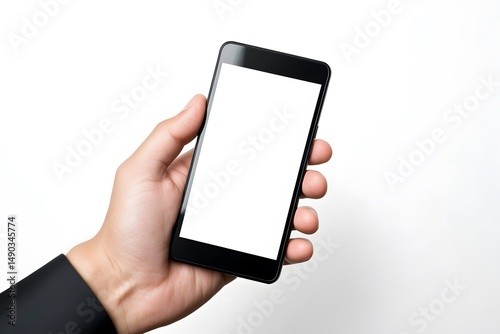 hand holding a smartphone with a mobile phone blank screen and white screen for touchscreen device technology and communication
