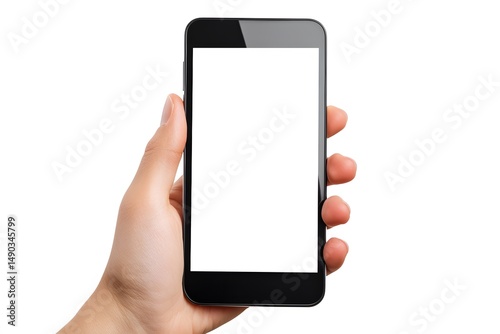 hand holding a smartphone with a mobile phone blank screen and white screen for touchscreen device technology and communication