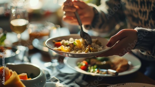 Hand holding a spoon to scoop food for loved ones Include a meal with the family The family atmosphere is warm and friendly, food, deliciousness, warmth., Generative Ai.