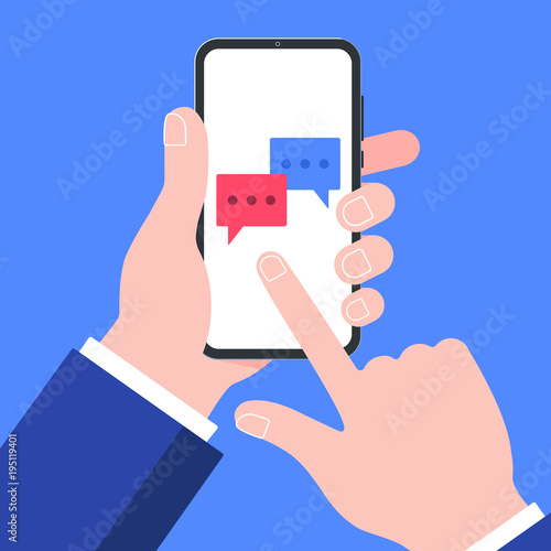 Hand holding black mobile phone isolated on blue background. Smartphone on human's hand with red and blue chat bubbles and index finger pointer touch the screen flat design vector illustration