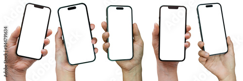 Hand holding blank screen mobile phone isolated transparent background, PNG File Format