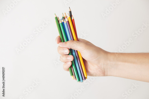 Hand holding colored pencils isolated on white background