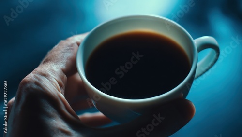 Hand Holding Cup of Dark Coffee Against Moody Blue Background