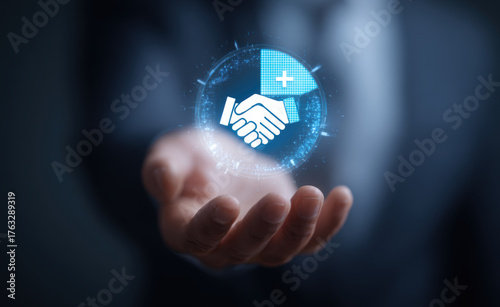 Hand holding digital icon of handshake and megaphone symbolizes business partnership and communication