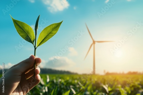 Hand Holding Fresh Leaves Near Wind Turbine