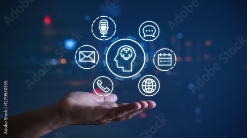 hand, palm, icon, communication, technology, collaboration, digital, cyberspace, connectivity, network, social, media, sharing, microphone, electronic mail, envelope, phone, call, earth, globe, calendar, date, message, chat, bubble, head, brain, thinking, solution, innovation, virtual, interface, connection, concept, artificial, intelligence, ai, future, business, modern, glowing, neon, light, dark, blue, background, abstract, datum