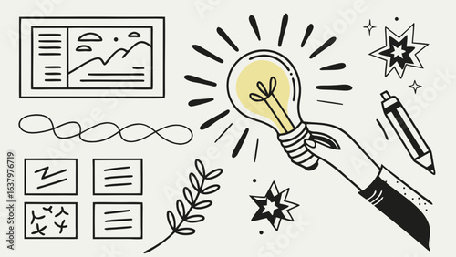 Hand Holding Illuminated Lightbulb with Design Elements.