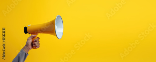 Hand holding megaphone on yellow background. Hiring, advertising and marketing concept. Generative AI