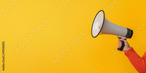 Hand holding megaphone on yellow background with copy space for text, banner design,symbolizing loud digital marketing promotion and sales. Concept of marketing advertising.