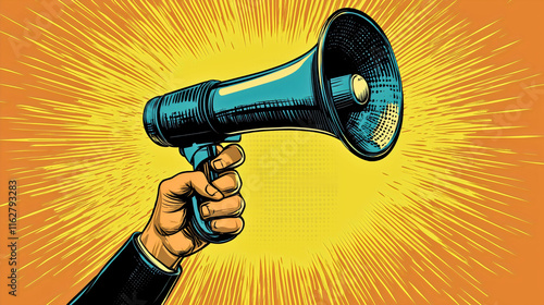 Hand holding megaphone with pop art dots, vintage speaker announcing sale, retro bullhorn promotional message, loud halftone advertisement