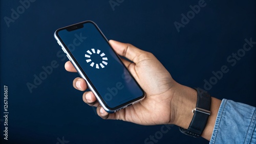Hand holding mobile phone displaying loading icon, representing the anticipation of advancement in technology and connectivity for future business innovation.