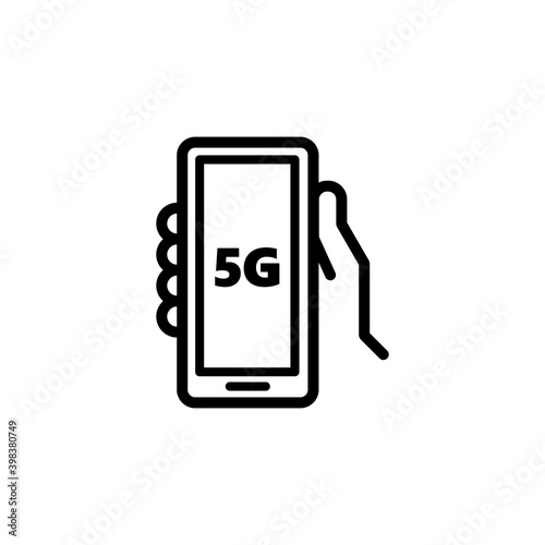 Hand holding mobile phone with 5g symbol on the screen. Vector icon. Connectivity and communication symbol.