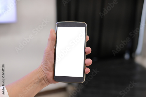 hand holding mobile smart phone at airport