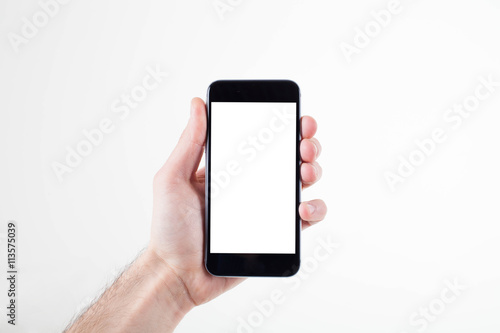 Hand holding mobile smart phone with blank screen