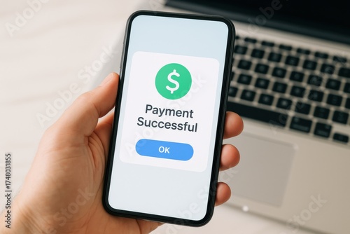 Hand Holding Smartphone Displaying Payment Successful Notification with Laptop in Background