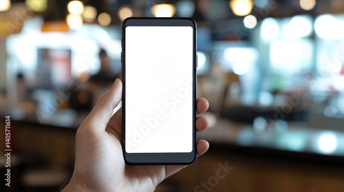 Hand Holding Smartphone in Café with Blurred Background